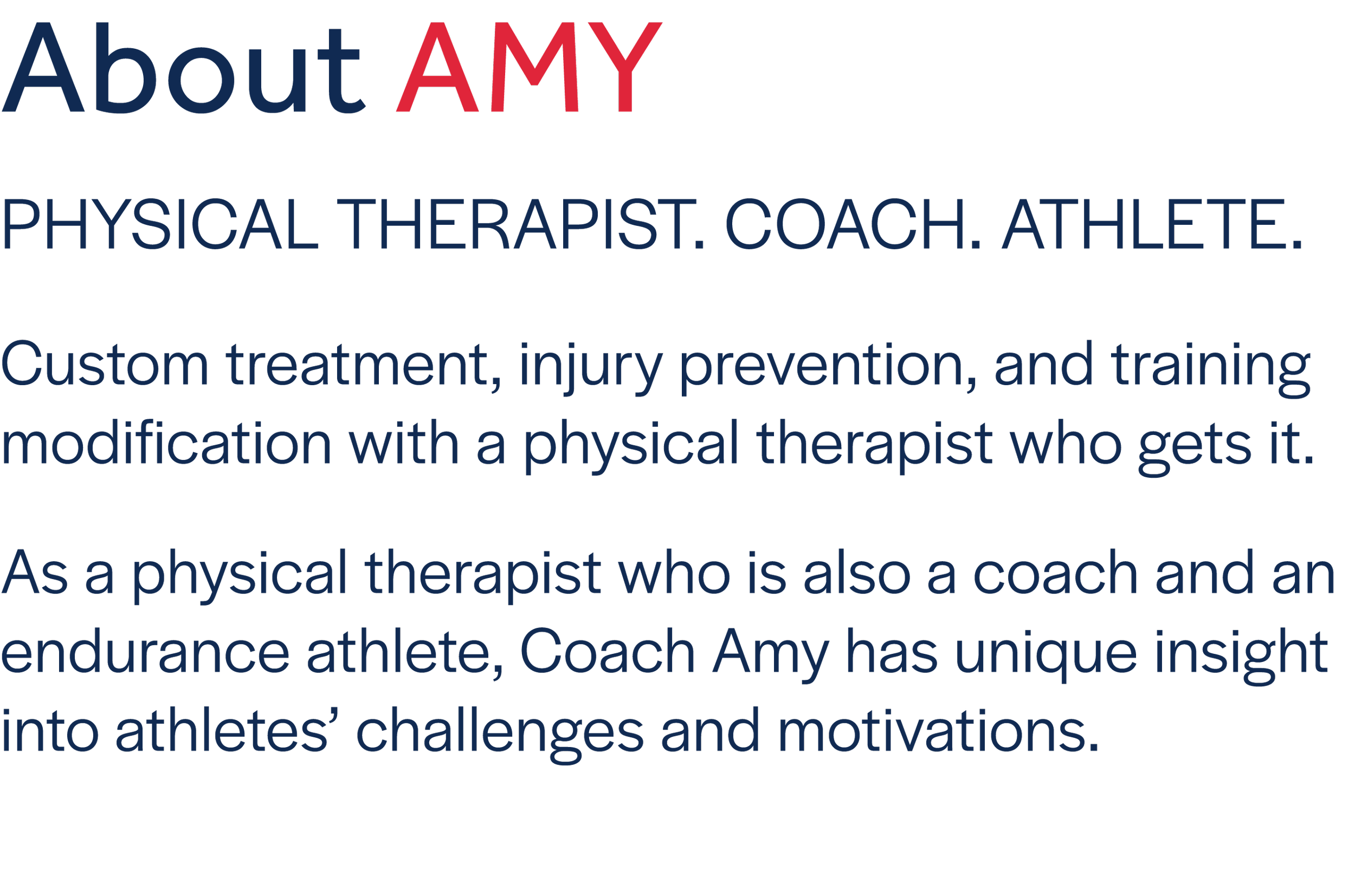 As a physical therapist, Coach Amy coaches all of her patients. Coach Amy teaches you why your treatment plan helps and how to continue to improve and prevent future issues.